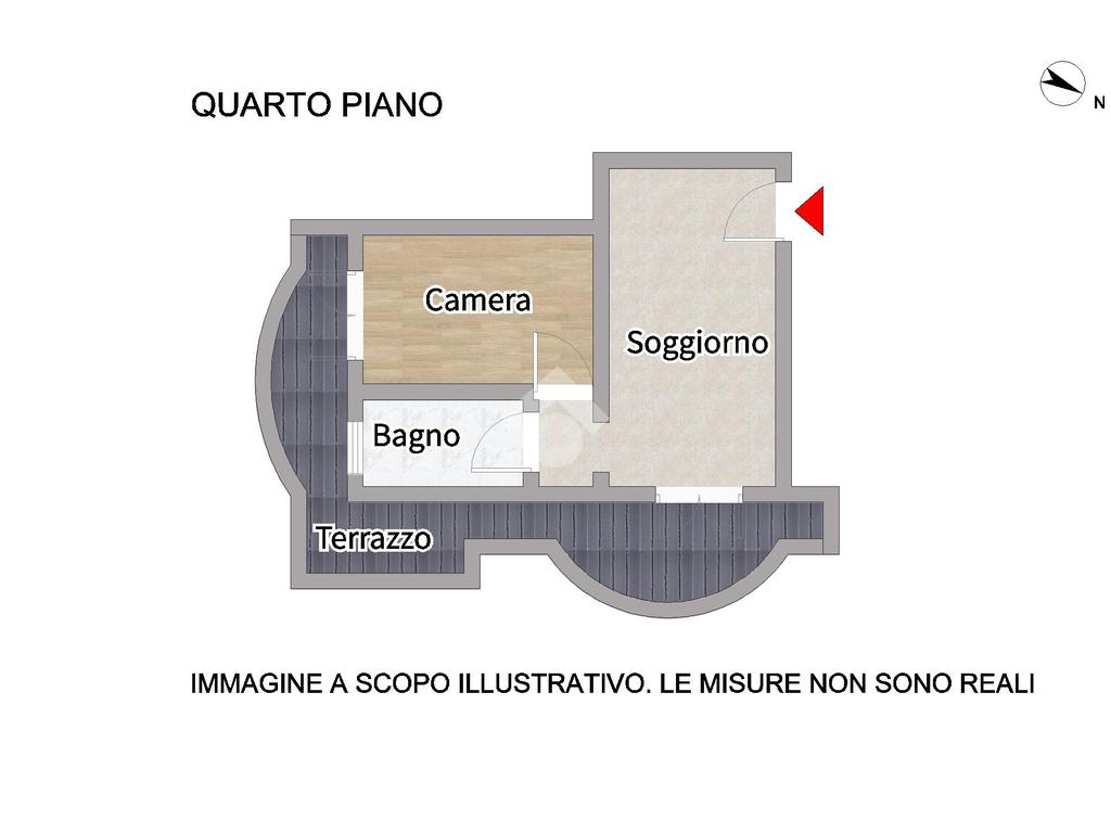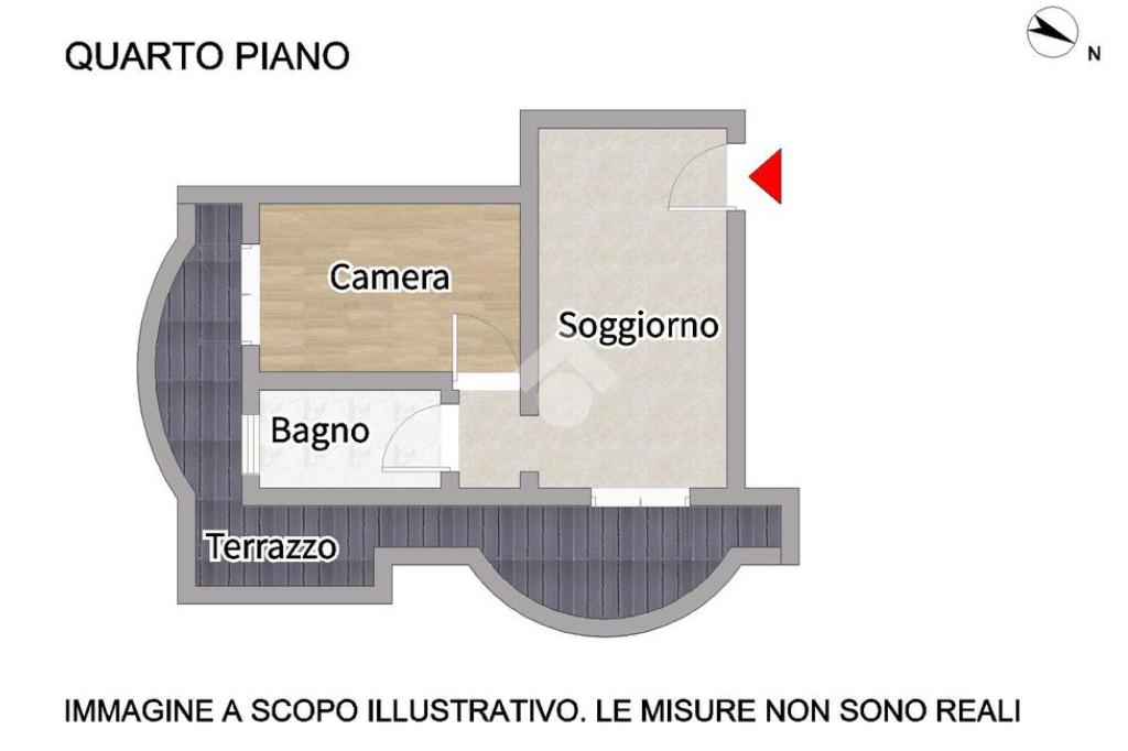 La soluzione è così composta: ingresso su soggiorno con angolo cottura con accesso al terrazzo abitabile; camera da letto matrimoniale con affaccio sullo stesso terrazzo e bagno finestrato con box doccia.